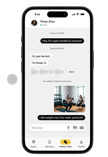 Users stay connected via an activity feed, engaging with partners’ goals through replies and likes for encouragement.
